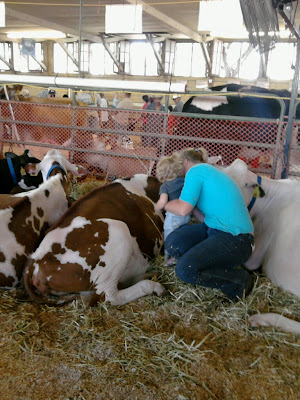 We decided to venture out to the fair again this year, with 2 main goals. Goal one, see all the animals and let Gwen go crazy mooing at them all. Goal 2, eat something fried to golden perfection! We went with our friends, so that's the little guy you'll see in some of these pictures. We forgot our camera, they had theirs, so all of these photos are courtesy of them. Thanks Ivins!